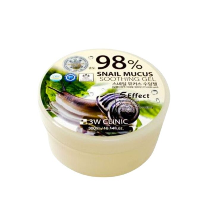 The 3W Clinic 98% Snail Mucus Soothing Gel in 300ml is a moisturizing and soothing gel formulated with a high concentration of snail mucus extract. It helps hydrate, calm irritated or sensitive skin, and promote skin regeneration. Ideal for those seeking intense moisture, it also aids in reducing redness, scars, and signs of aging. Suitable for all skin types, especially sensitive or damaged skin.