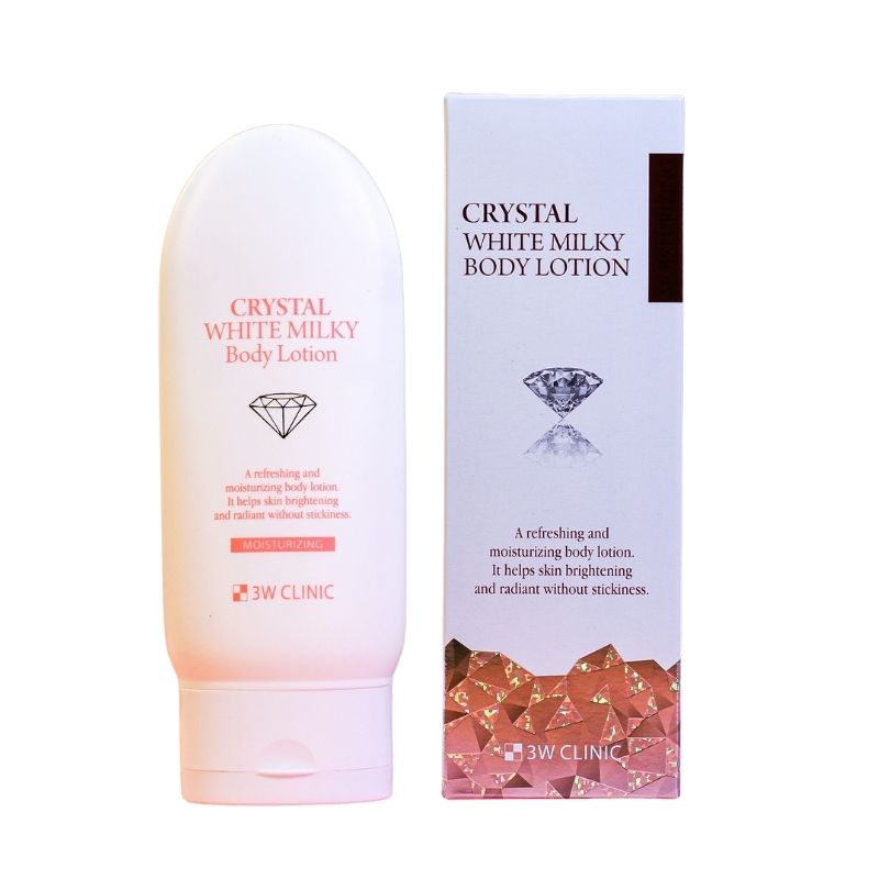 3W Clinic Crystal White Milky Body Lotion is a skincare product that claims to brighten and moisturize the skin. It comes in a 150g bottle and is designed to be used on the body.The lotion contains a blend of natural ingredients such as milk protein, pearl powder, and vitamin E, which work together to nourish and hydrate the skin. Milk protein is known for its ability to moisturize and soothe dry, irritated skin, while pearl powder is believed to help brighten and even out skin tone. The lotion has a milky consistency that feels lightweight and non-greasy on the skin. It absorbs quickly without leaving a sticky residue, and leaves the skin feeling soft, smooth, and radiant. Overall, 3W Clinic Crystal White Milky Body Lotion is a good option for those looking to improve the appearance and texture of their skin, while also providing it with essential moisture and hydration.