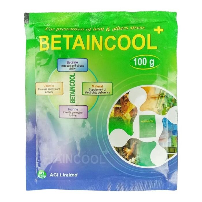 Betaincool Plus 100 gm is a scientifically formulated electrolyte and antistress supplement designed for poultry and fish. Enriched with essential vitamins, minerals, enzymes, and electrolytes, it helps combat dehydration, suffocation, and stress while enhancing immunity, digestion, and overall productivity. citeturn0search0