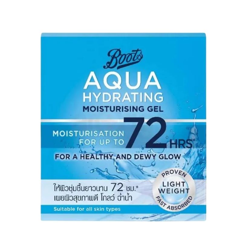 Boots Aqua Hydrating Moisturising Gel MOISTURISATION FOR UP TO 72 HRS* FOR A HEALTHY AND DEWY GLOW This skincare has proven, lightweight and fast with the powered of and Glyceryl Glucoside, to help moisturisation for up to 72 hrs with an instant 100% boost in skin hydration*. For a healthy and dewy glow. Suitable for all skin types