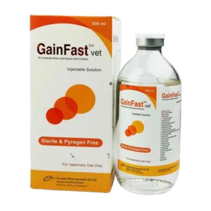 GainFast vet Injectable Solution help in protein formation. It acts as building blocking agent for the development of meat production. It also use for the milk production. For use as a supplemental source of glucose, electrolytes and amino acids for all animals. Supporting therapy on the operation and after operation, convalescing, dehydration weakness, vomiting, diarrhea, imbalance of electrolytes, ketosis, anaphylaxis, acidosis and hypoproteinemia.