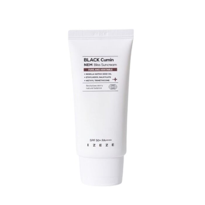IZEZE Black Cumin NEM Bliss Suncream SPF 50+ PA++++ is a high-protection suncream infused with black cumin and natural essence minerals (NEM). It provides broad-spectrum defense against UVA and UVB rays with SPF 50+ and PA++++ rating, ensuring excellent sun protection. The formulation likely includes nourishing ingredients that soothe and hydrate the skin while shielding it from environmental damage. It’s suitable for daily use, especially for those looking for a robust, natural sun shield.