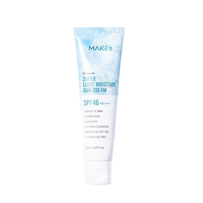 MAKE9 Focus On Super Light Moisture Sun Cream SPF46Â A moisturizing sunscreen with natural ingredients for sensitive skin. It also contains SPF 46 PA+++ which provides broad-spectrum protection against UVA and UVB rays. The cream is suitable for all skin types “With Broccoli Extract and PROBIO Meta G55 ingredients” this sun cream soothes tired skin from the hot sunlight, and the centella asiatica and hyaluronic acid complex continue to supply moisture to maintain the skin healthy for a long period of time. The moist and mild UV protection ingredients do not cause irritation and burning eyes, and prevent UV rays, UVA and UVB seamlessly.