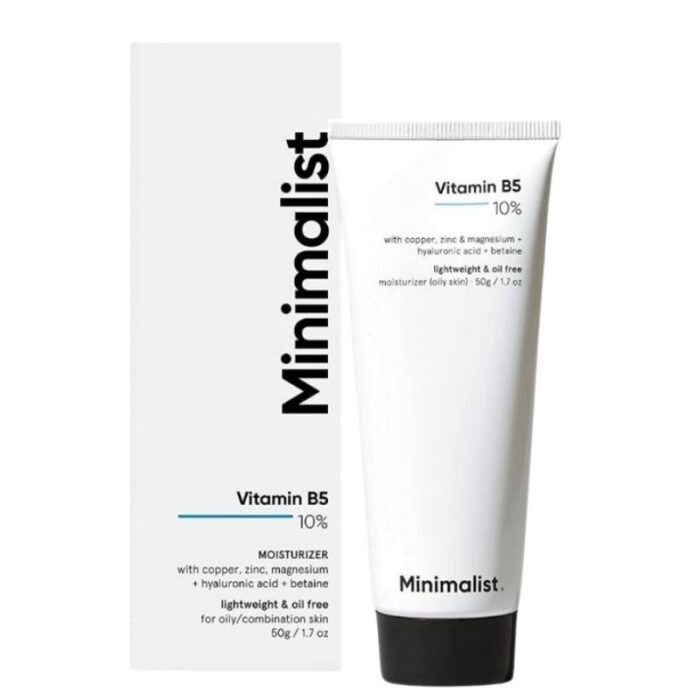 Minimalist Vitamin B5 10% Moisturizer Provides Lightweight Moisturization & Repairs Skin An everyday moisturizer for hydrating, nourishing and repairing skin. A lightweight, oil-free product with high concentration of Vitamin B5 (Panthenol), formulated especially for oily / combination skin. •A very high concentration of Vitamin B5 / Panthenol (at 10%) for deep, oil-free moisturization and repairing skin •Combination of Zinc, Copper, & Magnesium has a radical scavenging effect. They inhibit the cellular free radical formation & provide clear, fresh skin •Boosted with Hyaluronic Acid & Betaine for providing multi-level hydration.