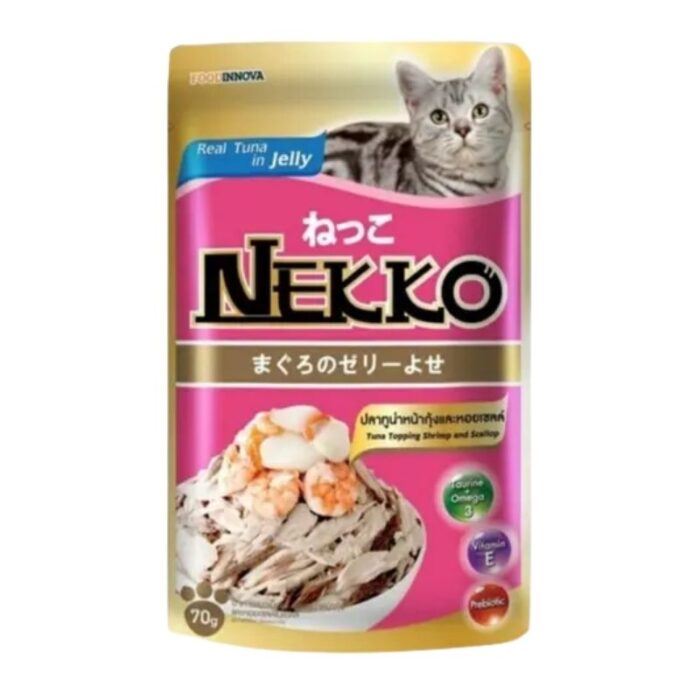 Nekko Pouch Tuna Topping Shrimp & Scallop In Jelly 70gm is a wet cat food product known for its mouth-watering taste. It is made from real tuna and contains added shrimp and scallop to enhance the flavor and provide variety. The product is designed to be appealing to cats.