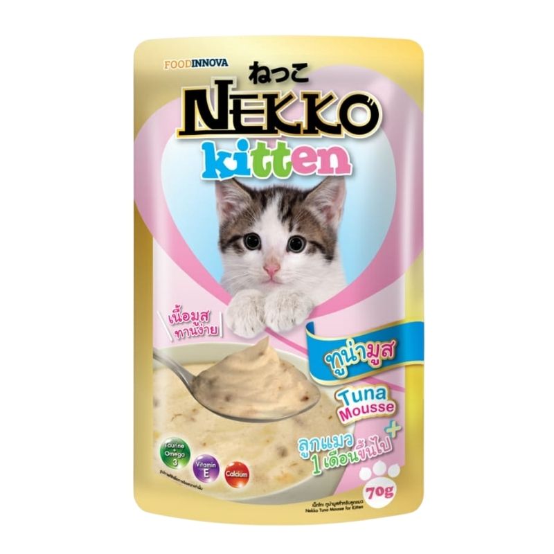 Nekko Kitten Pouch Tuna Mousse (Pink) is a 70g wet cat food that offers a delicious taste of tuna, specially formulated to entice kittens. It is a high-quality option created to provide a satisfying and nutritious meal for young cats.By offering a premium wet cat food option enriched with essential nutrients, Nekko aims to promote the overall health and well-being of growing kittens. With its high-quality ingredients and benefits such as omega-3 fatty acids, prebiotics, vitamin E, and taurine, it provides a nourishing and balanced diet for your young feline companion.