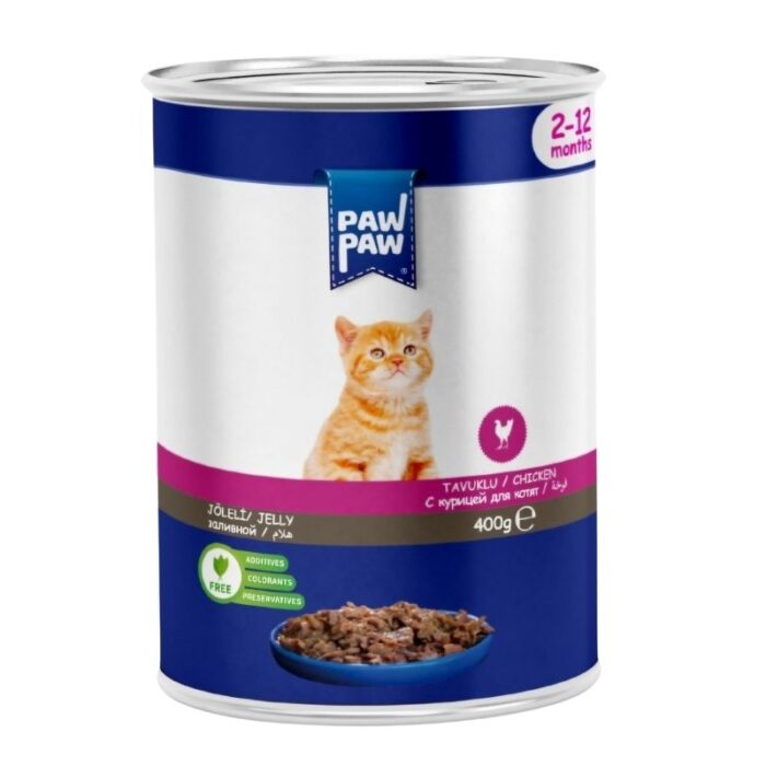 Paw Paw Kitten Cat Food in Chicken flavor is a wet food specially formulated to meet the nutritional needs of growing kittens. Each 400g can is packed with high-quality chicken, providing essential proteins and nutrients for healthy growth and development. citeturn0search1