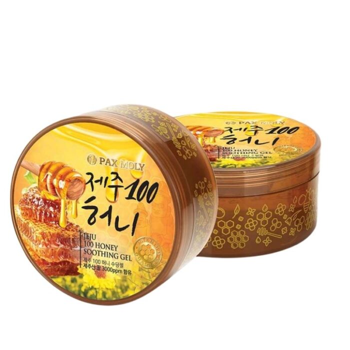 Paxmoly Jeju 100 Honey Soothing Gel is a skincare product that contains 100% pure honey extract from Jeju Island, a region of South Korea known for its natural beauty and pristine environment. The honey extract is rich in antioxidants and nutrients that can help nourish and hydrate the skin, while also providing anti-inflammatory and antibacterial properties.The gel formula of this product is lightweight and non-sticky, making it easy to apply and absorb into the skin. It also contains other natural ingredients such as aloe vera, green tea extract, and chamomile extract, which are known for their soothing and hydrating properties.Paxmoly Jeju 100 Honey Soothing Gel is designed to help calm and soothe irritated or sensitive skin, reduce the appearance of fine lines and wrinkles, and improve overall skin texture and tone. It can be used as a daily moisturizer or as a spot treatment for specific areas of concern.