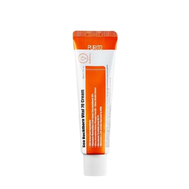 Purito Sea Buckthorn Vital 70 Cream is a moisturizing cream that helps to revitalize and nourish the skin. It contains 70% sea buckthorn extract, which is rich in vitamins and antioxidants, and helps to soothe and heal the skin. The cream also contains other natural ingredients such as jojoba oil, shea butter, and centella asiatica extract, which work together to provide intense hydration and improve skin elasticity. It has a lightweight and non-greasy texture that is quickly absorbed into the skin, leaving it feeling soft and smooth. It is suitable for all skin types, especially those with dry, sensitive, and aging skin.