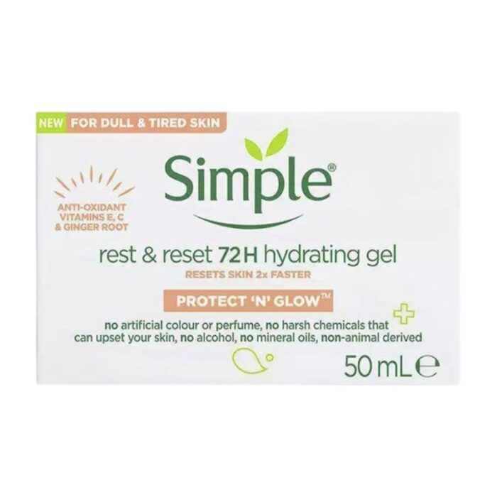 Simple Protect ‘N’ Glow Rest and Reset 72h Hydrating Gel 50ml 72h Hydrating Gel rests dull and tired skin with brightening antioxidants Vitamin C & E and organic Ginger Root Extract. This gel-textured night cream boosts your skin’s natural renewal process, for glowing skin by morning. Like all Simple products, it’s 100% free from artificial colour and perfume and has no harsh chemicals that can upset your skin.