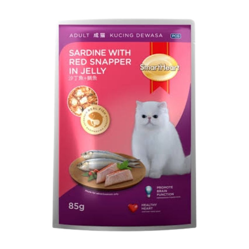 Arogga offers SmartHeart pouch Sardine with Red Snapper in Jelly 85gm, a convenient and nutritious meal for your feline friend.