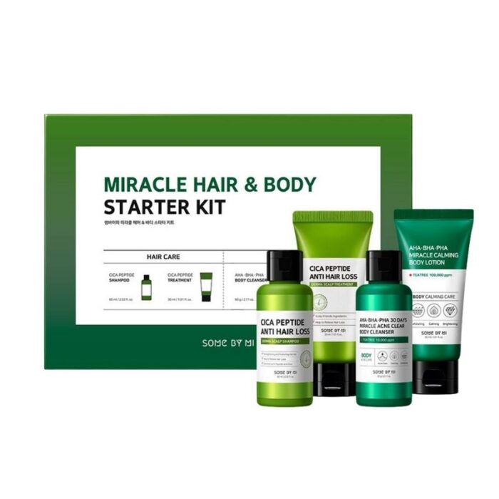 The Some By Mi Miracle Hair & Body Starter Kit is a curated set designed to gently cleanse, nourish, and hydrate both your hair and body. This kit typically includes travel-sized or sample-sized products that allow you to experience the benefits of the full-range items, perfect for those looking to try out the line or for convenient travel use.