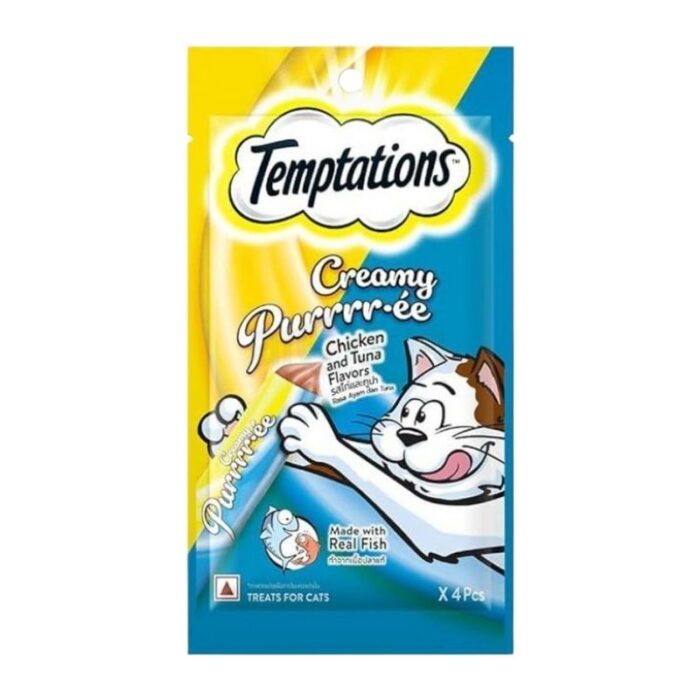 Temptations Creamy Purrrr-ée Cat Treats in Chicken & Tuna Flavors are delectable, squeezable treats designed to delight your cat’s taste buds while providing essential nutrients. Each 48g pack contains four individual pouches, making them convenient for serving.