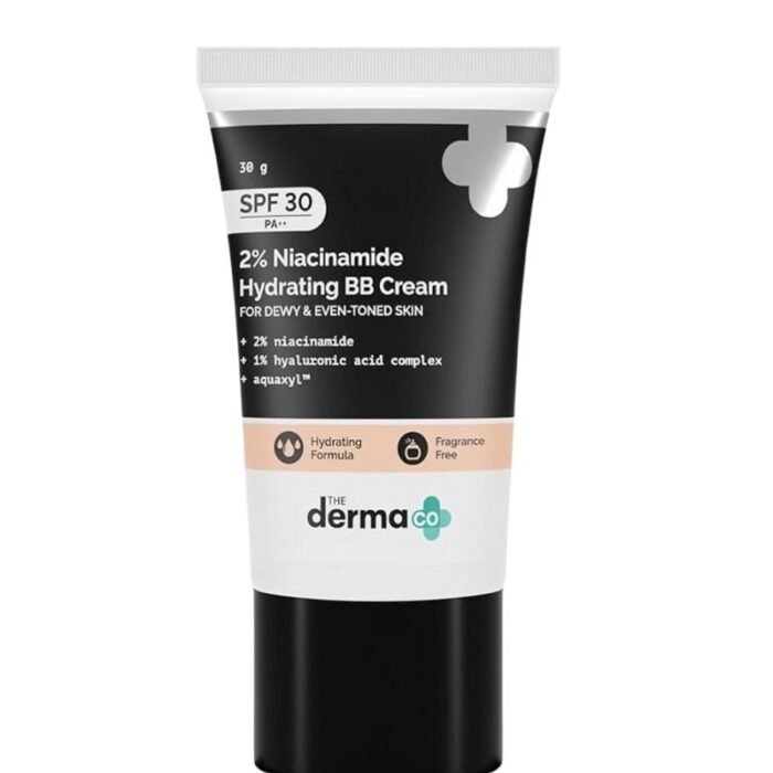 The Derma Co 2% Niacinamide Hydrating BB Cream When makeup meets skincare, the results are sure to leave you spellbound! Make way for our 2% Niacinamide Hydrating BB Cream in Nude Shade with SPF 30, that effortlessly gives you perfect coverage and superbly smooth skin. Power packed with Niacinamide, it is not just any BB Cream – it evens skin tone and reduces pigmentation while fading dark spots. Ever heard of BB Cream doing all this? There’s more! The bb cream derma co of Aquaxylâ„¢ & Hyaluronic Acid holds water molecules onto the surface of your skin to keep it hydrated and smooth.