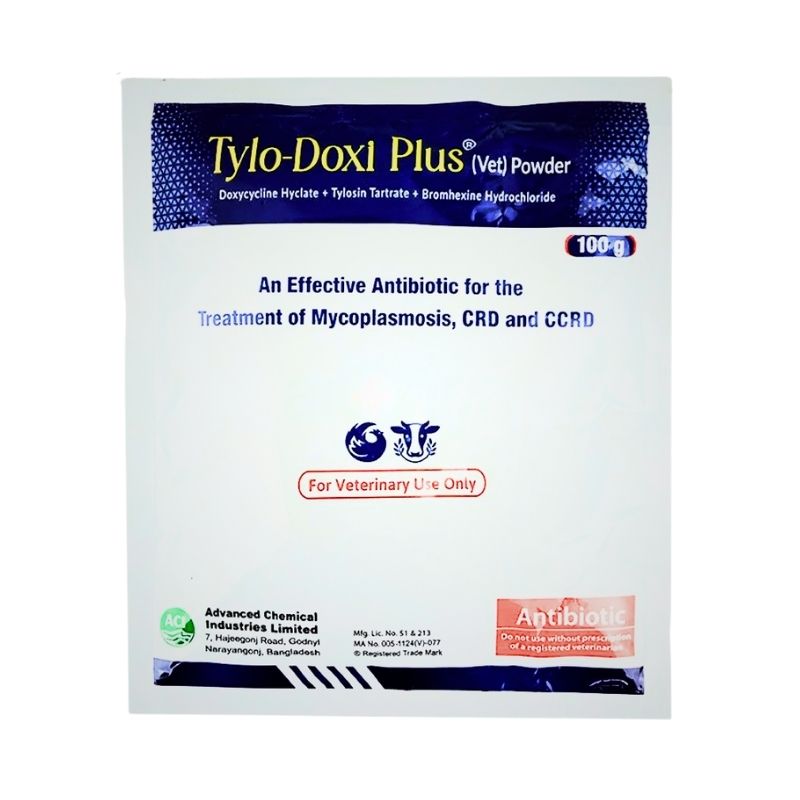 Tylo-Doxi Plus Powder (Vet) 100gm Pack is a veterinary medication commonly used to treat bacterial infections in livestock and pets. The product combines Tylosin (an antibiotic) and Doxycycline (a broad-spectrum antibiotic), which work together to target a wide range of bacterial pathogens, providing effective treatment for various infections.