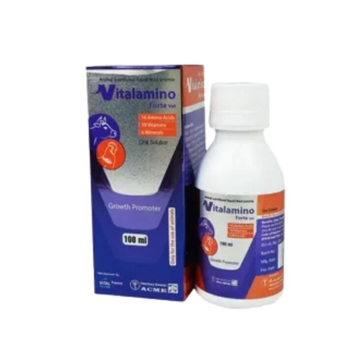 Vitalamino Forte Vet 100ml is a specialized nutritional supplement formulated for veterinary use. It is designed to support the overall health, vitality, and recovery of animals, especially those that require additional nutritional support due to illness, stress, or high activity levels. This supplement typically contains a balanced mix of vitamins, minerals, amino acids, and possibly other nutrients tailored to meet the specific needs of different animals.